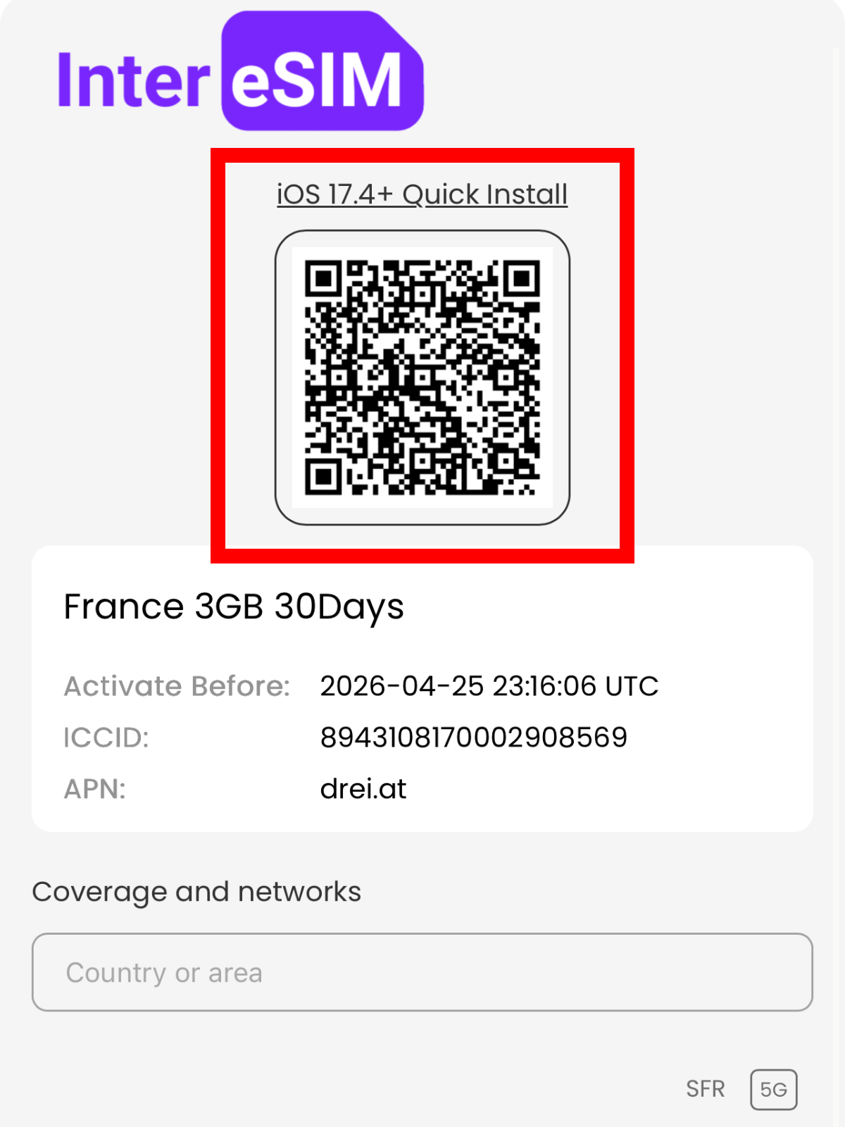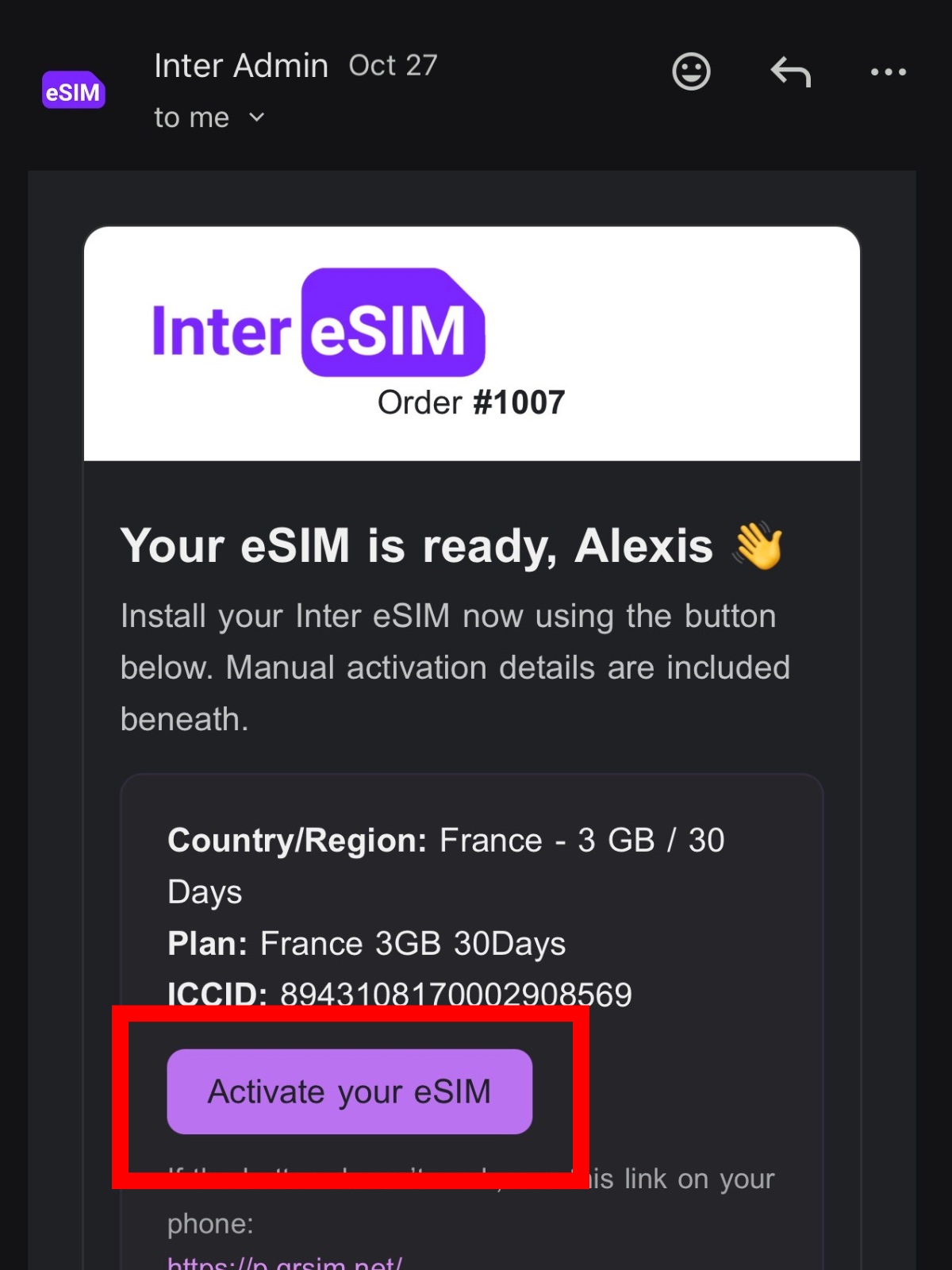 Instantly after your purchase, you will receive your eSIM by email. Simply click the button to start the activation.