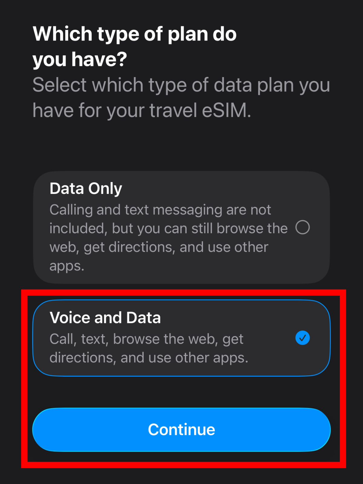 Select "Voice and Data" if you get asked about the eSIM type. Then, press "Continue".
