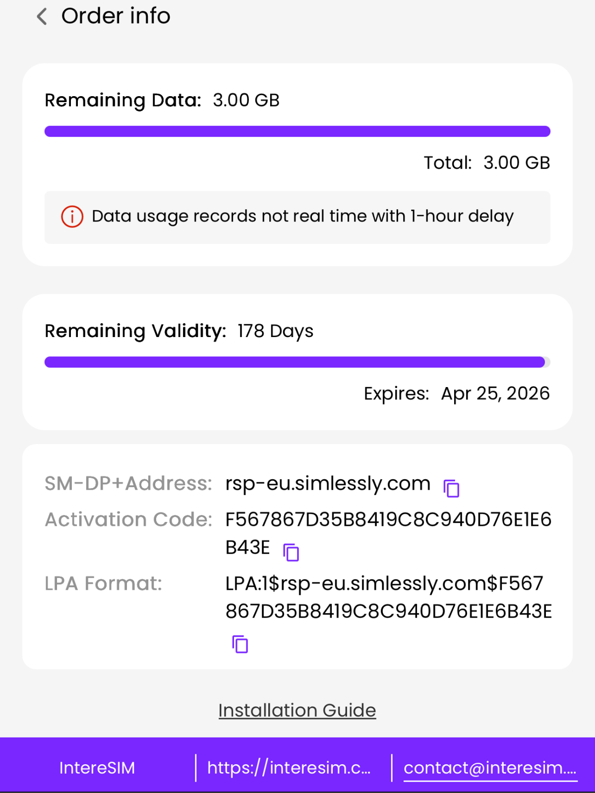 You can check your data usage and remaining validity by clicking the "Check Usage" button on the link you received by email. This page is where you can manage your eSIM.